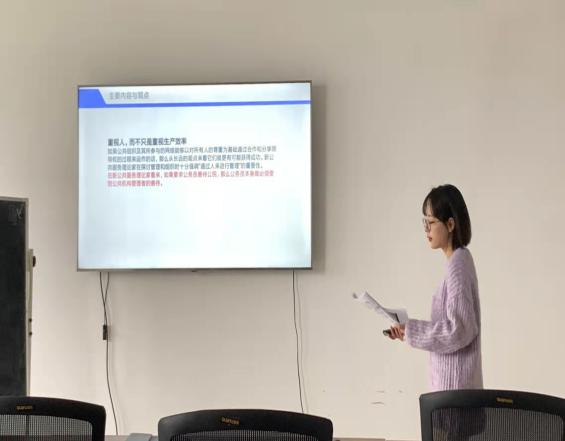 王静玥同学分享的书目是《通往奴役之路》,这本书的作者是哈耶克。她从作者简介、本书简介、主要内容与观点、批判与反思、现实启示与运用这五个方面展开介绍,着重介绍了本书的基本内容与情况,以及我国在发展过程中可以吸取采纳的宝贵经验。汇报后,宋兆祥博士对其汇报内容进行了点评,指出王静玥同学较完整的归纳了此书的基本内容,并且可以指出哈耶克的这本著作对我国建立现代良序的法治社会有着很大的借鉴意义,对大家进一步理解自由和市场经济有着重要的参考价值。