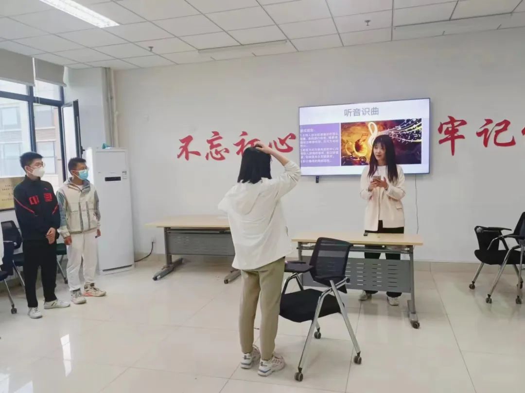 专业的理论知识介绍不免会显得有些枯燥乏味,为真正让大家释放压力,心委带领大家开展互动游戏。在“听音识曲”游戏环节,大家要听歌曲前奏猜出歌名。从国风到嘻哈,从当下的流行曲目再到动画片的主题曲,面面俱到。正如有句话所说的那样“音乐是治愈人心灵最好的良药”,这十几首歌曲的前奏已经充分调动起了大家的情绪,西学楼1515的教室里逐渐开始充满了笑声。