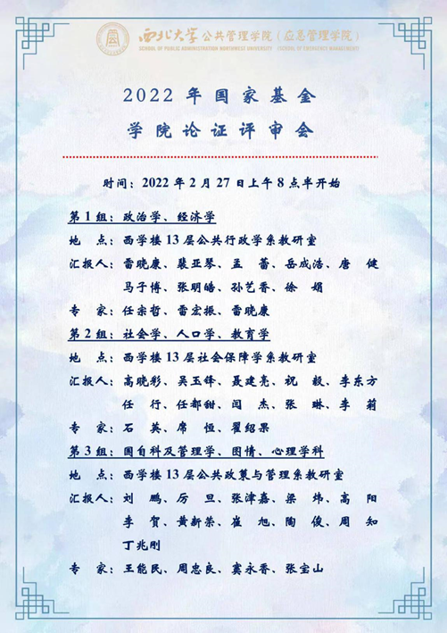 2022年2月27日上午,565net必赢2022年国家基金论证评审会根据不同学科方向分别在西学楼13层公共政策与管理系教研室、公共行政教研室、社会保障教研室举行,任宗哲、雷宏振、石英、王能民、周忠良、窦永香、张宝山、席恒、雷晓康、翟绍果等教授作为论证专家出席了评审会,我院三十余位教师分别从研究主题、研究背景、研究意义、研究思路、研究创新、研究基础等方面汇报了自己的研究设计,专家们认真阅读了汇报人的申请书,并根据老师们的汇报指出申请书存在的问题和改进方式,各汇报老师认真听取了与会专家的修改意见,并表示会在会后继续对研究设计论证进行修改完善。本次论证会持续了三个多小时,取得了圆满成功,各参会老师均表示在与评审专家的交流中受益匪浅。