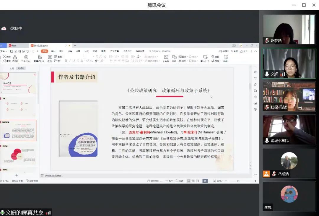 2020级行政管理专业硕士研究生文妍同学分享了迈克尔·豪利特与M.拉米什合著的《公共政策硏究——政策循环与政策子系统》。汇报主要从作者及书籍介绍、内容概述、案件分析以及不足四个方面进行,主要介绍了公共政策的循环过程,将公共政策过程分为议程设定、政策规划、政策决策、政策执行和政策评估五个阶段。并通过青岛市政府购买养老服务案例分析,让大家更加清楚公共政策的具体实施过程。