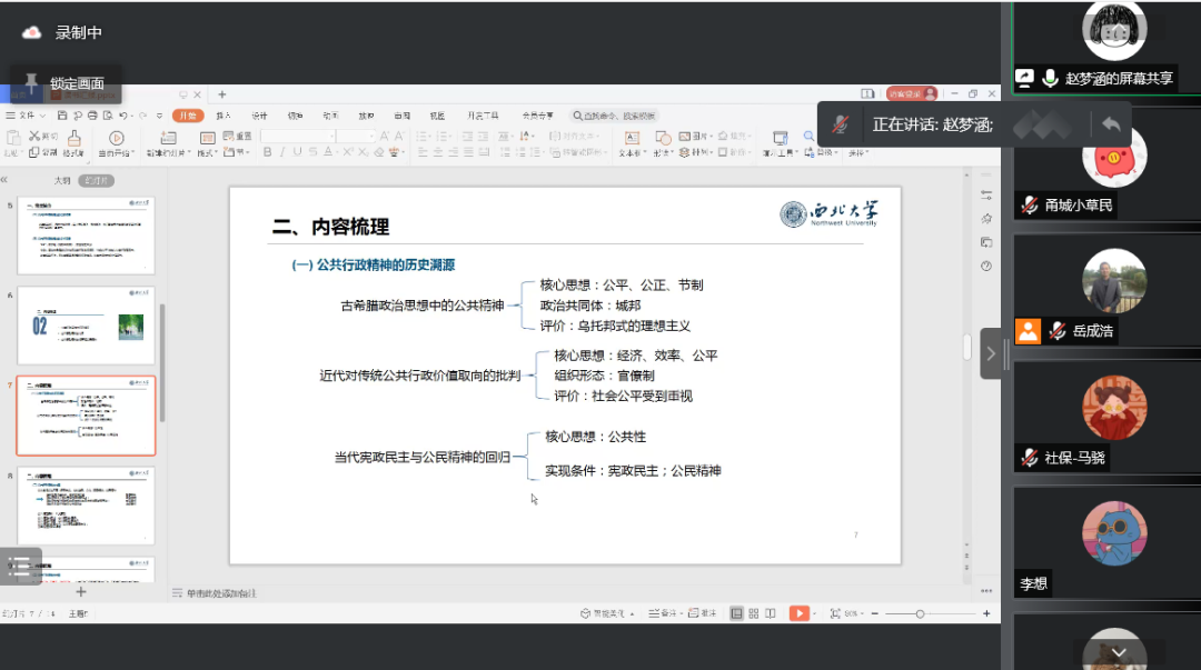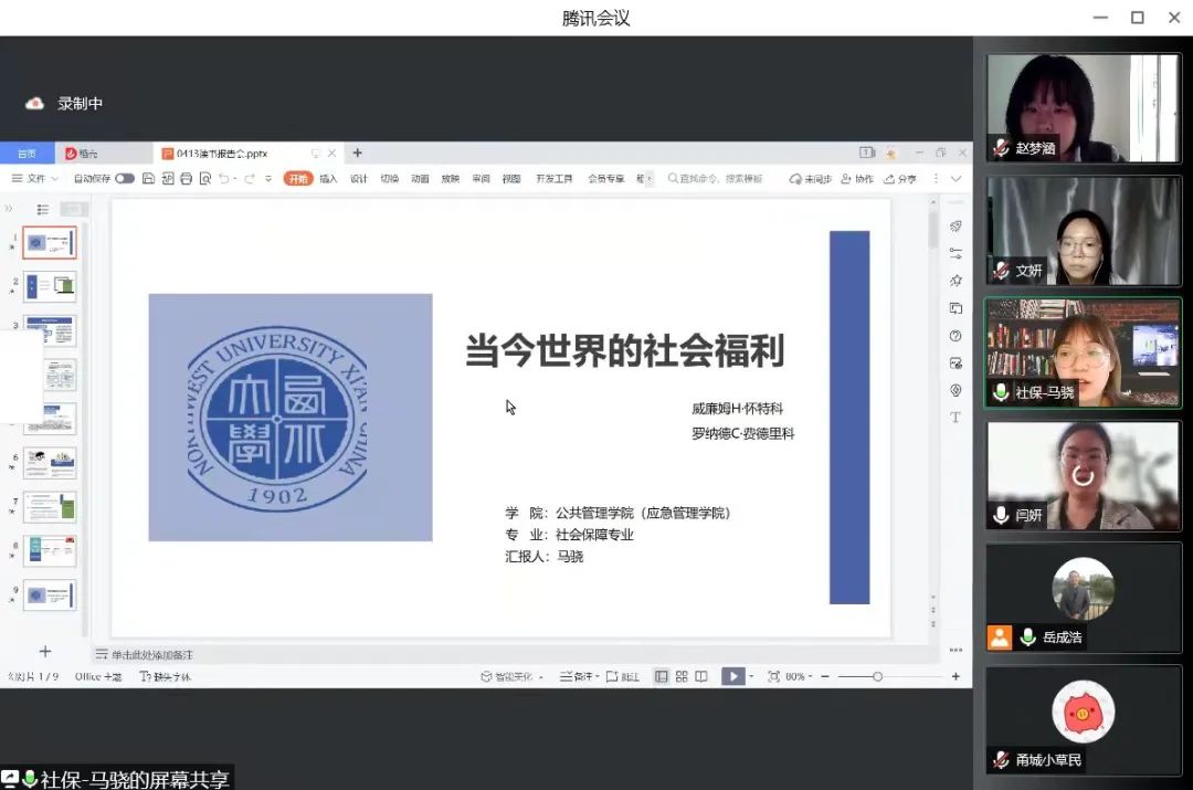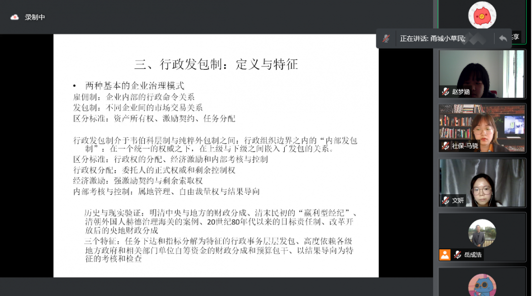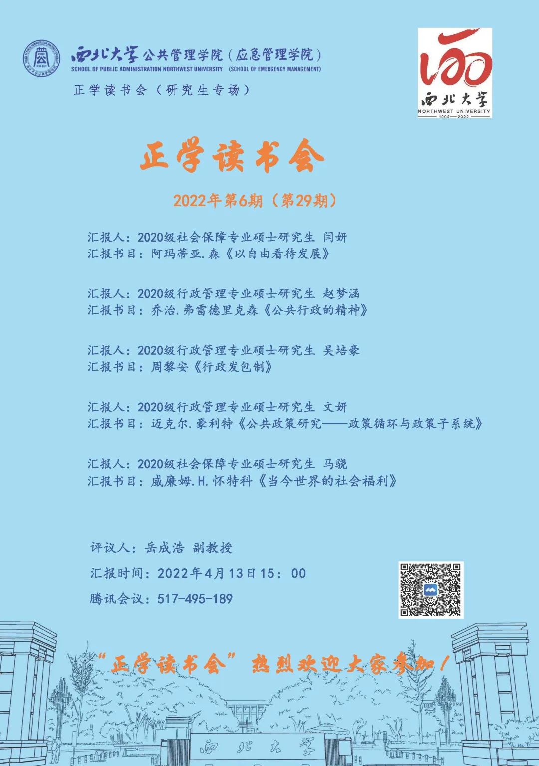 2022年4月13日下午,我院举办了本学期第6期研究生读书分享会。2020级行政管理专业研究生赵梦涵、文妍、吴培豪,2020级社会保障专业研究生马骁、闫妍进行了分享,岳成浩老师担任评议人。