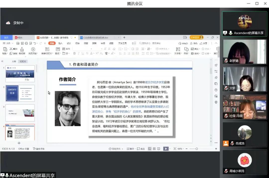 2020级社会保障研究生闫妍分享的书目是《以自由看待发展》,在这本书中,森精致、简明而范围广泛地阐述了这样一个概念—经济发展就其本性而言是自由的增长,他运用历史事例、经验证据以及有力而严格的分析。闫妍主要从作者和译者简介、写作背景、核心概念与理论框架、评价与启示四个方面介绍,她从文中两个重要命题:自由作为价值标准及其信息基础和自由作为发展的重要手段入手,详细介绍了森的思想和对中国的启示。