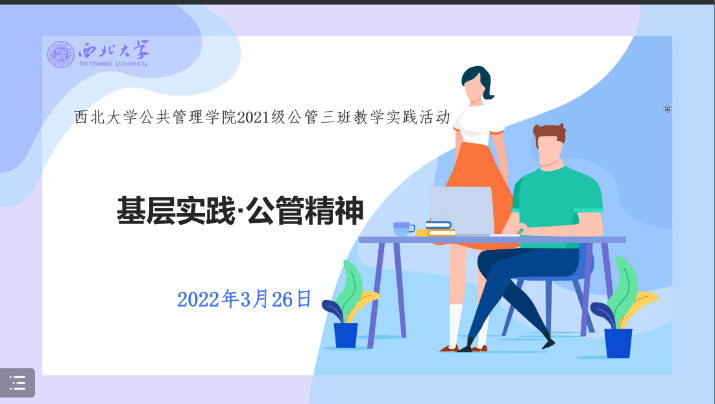 教学实践是教育教学内容的重要组成部分,旨在提高学生的实践能力和综合素质,是学生走向社会的一个重要锻炼环节。为进一步促使同学们融入社会,加强对教学理论与实践二者关系的把握,发展个人思维,于3月26日上午11点以线上会议的形式开展2021级公管3班第一次教学实践活动,邀请到陕西省永寿县政府副县长、甘井镇党委书记蔡延东博士作以大学规划与基层工作实践经验分享,此次会议由班主任李莉老师主持。