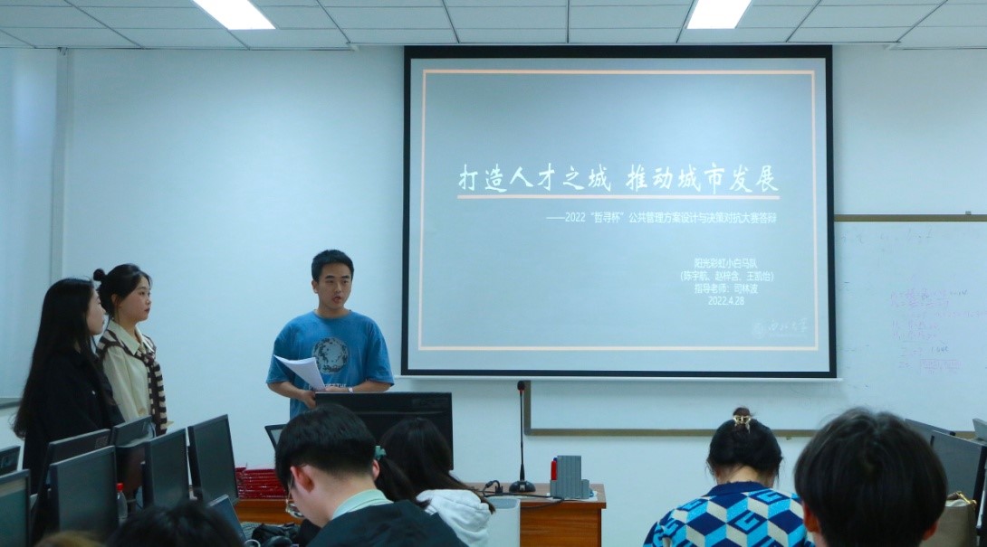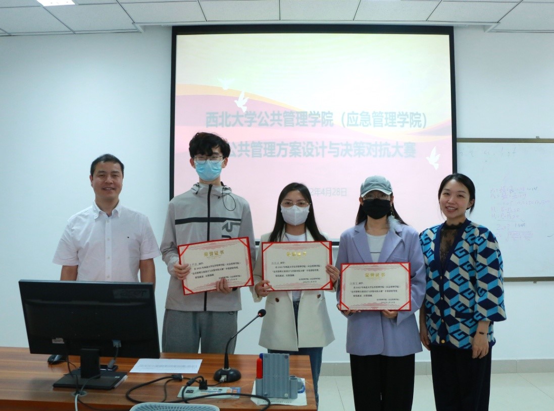 为提高学生的创新能力及学以致用能力,4月28日,学院在信息实验室举办2022年公共管理方案设计与决策对抗大赛。共有6支队伍、12名同学参加了比赛,大赛聘请王欣亮副教授、聂建亮副教授、高阳博士组成专家组进行评议。经过5轮沙盘对抗和总结答辩等程序,最后来自2020级“阳和启蛰”代表队的王梓赫、向敬宣、汤梓瑶3名同学获得特等奖,将代表学院参加西北赛区的比赛。