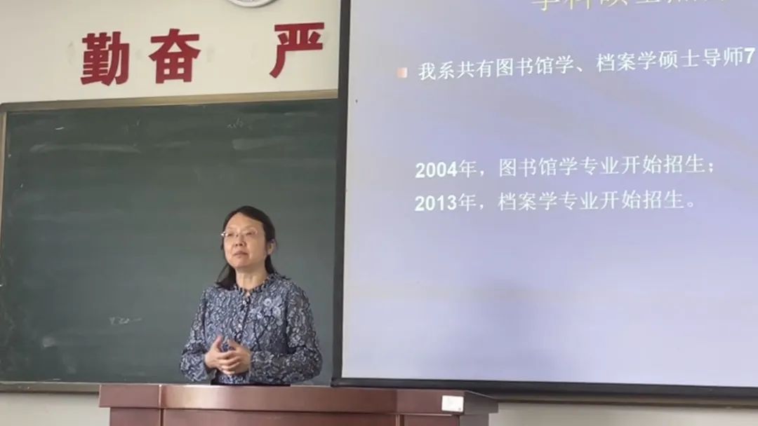 接下来,崔旭教授对我院图书情报、档案管理一级学科硕士点进行介绍,并通过图表数据分析展示并分析往届企业就业、考公考研情况。崔旭教授指出,在学业方面,两个专业各有特色,优势明显;在就业方面,学生们应注重掌握并适应当下人才市场的新模式、新趋势、新需求。崔旭老师的讲解有力地增强了学生们的就业信心,坚定了他们对投身于图书馆学或档案学专业的未来选择。