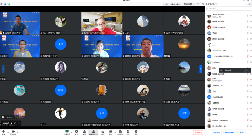 我院雷晓康教授、翟绍果教授、王淑珍教授、何君安副教授、王峥副教授、陶俊副教授、周文光讲师、马子博讲师、张明皓讲师、李莉讲师、厉旦讲师分别作了“《‘十四五’文化发展规划》解读” “走向中国特色的公共管理:基本问题、话语生态与制度文明”、“突发公共卫生事件下个体道德判断与防控依从性的关系”、“关于坚定中华文化立场和文化自信、深化中外文化交流互鉴的若干断想”、“应急广播体系中的应急情报嵌入与公共情报服务”、“加快文旅融合,促进陕西文化高质量发展”、“中国特色哲学社会科学构建:继往开来的应急管理知识体系构建”、“公共文化服务均等化的内设逻辑:基于回应性治理的视角”、“以文化人:乡村文化治理的实现路径”、“西部地区基层文化人才队伍建设的初步思考”、“丰富老年人文化生化,促进老年人身心健康”等主旨报告,从不同学科角度对《“十四五”文化发展规划》进行了解读,受到与会者一致好评。