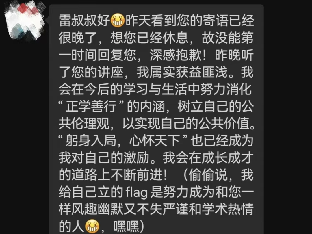 课后,雷院长给予新生以亲切寄语,同学们也与雷院长进行了积极互动。雷院长语言风趣,观点精妙,指点深刻,振奋人心,令同学们感触颇深。学生们坦言,雷院长的讲话极大地助力新生们快速适应大学的学习生活,帮助同学们找到了专业学习的正确方向,为学生们未来事业路线做出了指导和规范。