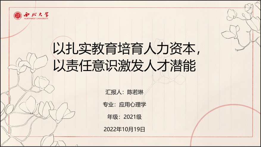 2021级硕士研究生陈若琳作了题为《以扎实教育培育人力资本,以责任意识激发人才潜能》的汇报。她认为,扎实推进我国人才储备和人才体系建设,需要在党和国家对人才工作的指导下,一方面发挥中国特色社会主义的教育制度优势,推进教育公平和教育现代化进程,进而有效进行人力资本投资,提升国家人力资本存量;另一方面着力培养新兴人才的责任意识,以责任激发人才动力和潜能,使我国的制度优势有效转化为人才资源的巨大优势,以提升竞争力。