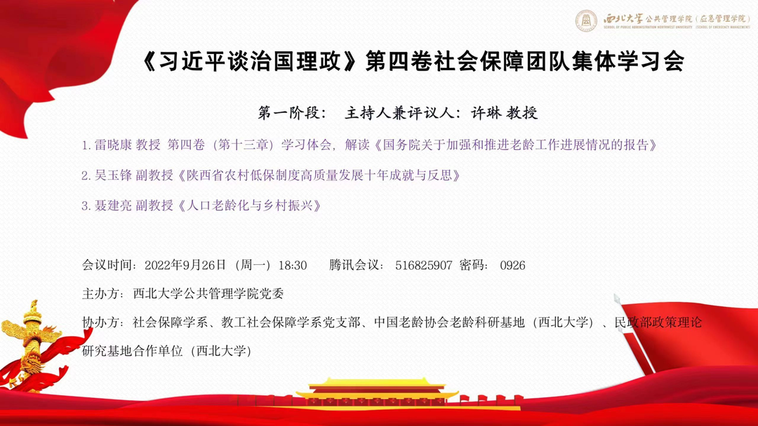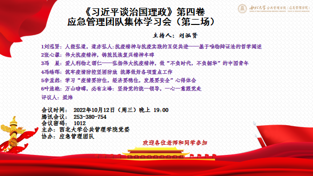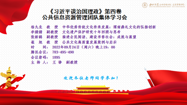 2022年9月底10月初,我院公共行政学系、社会保障学系、信息资源管理学系、人力资源管理系、公共政策与管理系等各个系与学科团队分别举行了《习近平谈治国理政》第四卷集体学习研讨会,与会师生从各自学科角度畅谈了学习收获,加深了对《习近平谈治国理政》第四卷内容和精神的理解。