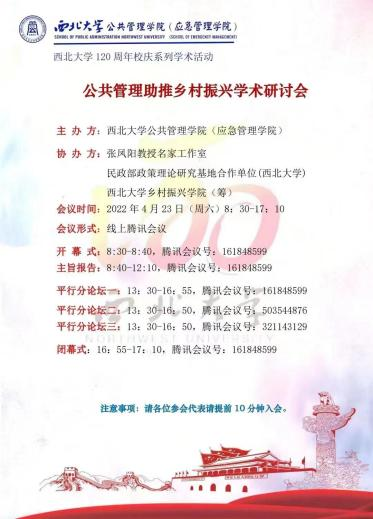 565net必赢客户端主办、张凤阳教授名家工作室、民政部政策理论研究基地合作单位(西北大学)、西北大学乡村振兴学院(筹)承办的“公共管理助推乡村振兴”学术研讨会于2022年4月23日以腾讯会议的形式顺利召开。来自南京大学、浙江大学、中国社会科学院大学等约20所高校单位和科研单位的将近180名学者参加了本次会议。本次研讨旨在响应国家战略号召,推进乡村振兴发展,同时为西北大学120周年校庆献礼。