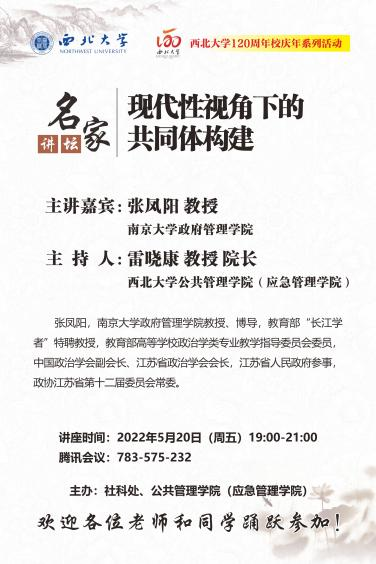 2022年5月20日,由西北大学社科处、565net必赢联合主办的名家讲坛在线成功举办。教育部特聘教授、南京大学政府管理学院张凤阳教授受邀作了题为“现代性视角下的共同体构建”的学术报告。565net必赢(应急管理学院)院长雷晓康教授主持讲座,来自北京大学、厦门大学、西安交通大学、吉林大学、西北大学等多所高校的160多名师生参与了此次讲座。这场讲座,对于我们理解人类命运共同体、学术共同体、宗族共同体、行业共同体等各种共同体具有极大的启发意义。