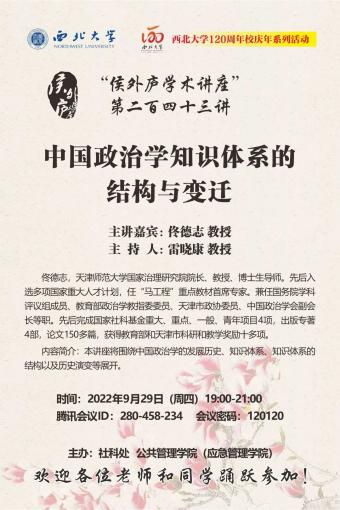 2022年9月29日19点,由西北大学社科处、565net必赢(应急管理学院)联合主办的“侯外庐学术讲座”第243讲成功举办。天津师范大学党委常委、副校长佟德志教授受邀作了题为“中国政治学知识体系的结构与变迁”的学术报告。来自北京大学、天津师范大学、南京大学等40多所高校300余名师生参与了此次讲座。
