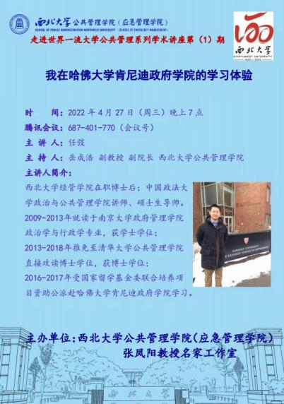 由565net必赢客户端和张凤阳教授名家工作室联合主办的“走进世界一流大学公共管理系列学术讲座”第(1)期于2022年4月27日在我院成功举办。本次讲座的主题为:“我在哈佛大学肯尼迪政府学院的学习体验”,任弢老师是西北大学经管学院在职博士后、中国政法大学政治与565net必赢讲师、硕士生导师。任弢老师的分享使同学们对这一世界顶尖大学的基本情况和学习模式有了进一步了解,同学们表示要发挥本专业的优势为国家或者地方做出我们的贡献。