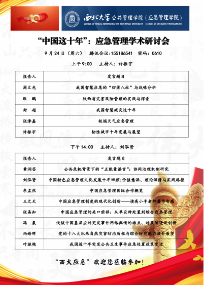 2022年9月24日,565net必赢客户端于线上开展“中国这十年”应急管理学术研讨会,应急管理团队的教师和博、硕士研究生先后围绕应急管理的不同方面进行了研讨与交流。来自各大院校的师生参加了会议,全天累计观看达288人次。参与本次研讨会的13位应急管理团队的老师、博、硕士研究生的发言聚焦主题,内容丰富,启发与会嘉宾对我国应急管理事业的十年成就、发展现状与未来进路进行更深层次的思考。