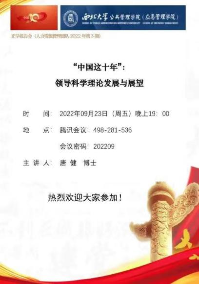 2022年9月23日晚7时,由我院主办、人力资源管理团队协办的“中国这十年”系列报告会在腾讯会议线上进行,唐健老师就“中国这十年:领导理论发展与展望”进行了专题报告,来自四川大学、南开大学、北京理工大学、鲁东大学等高校的60余名师生参与了线上会议。会后参与师生就相关问题与唐健老师进行了交流互动,“中国这十年:领导理论发展与展望”专题讲座圆满结束。
