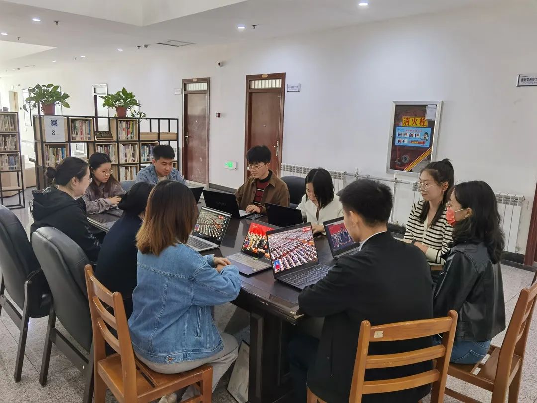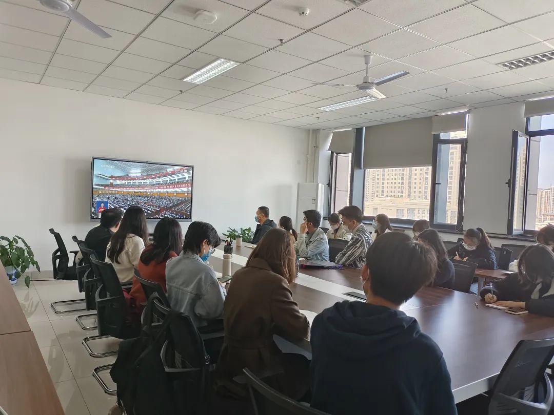 学院党委副书记韩杰、全体辅导员和学生干部于西学楼1306中型会议室集体观看学习。