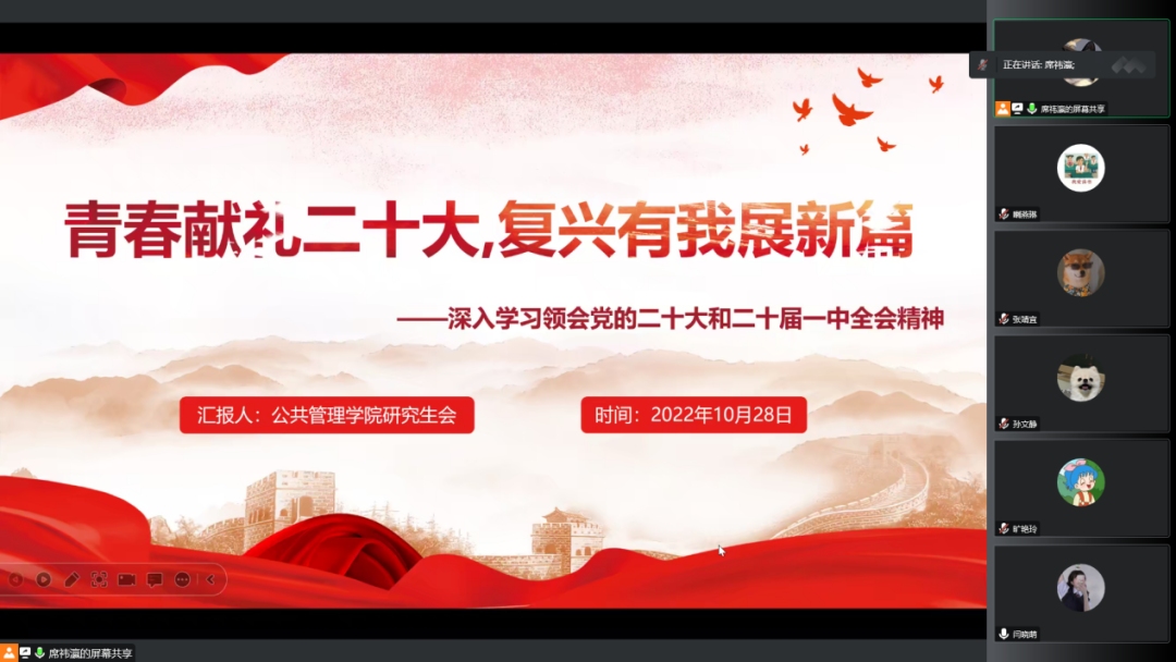 10月28日,565net必赢研究生会以“青春献礼二十大,复兴有我展新篇”为主题线上开展集体学习。本次活动由研究生会主席团成员席祎瀛主持。本次学习活动深刻传达了党的二十大报告的重要精神,旨在引导研究生会全体工作人员全面系统领会大会精神的丰富内涵与核心要义,从中感悟真理力量、汲取智慧养分。各部门成员应牢记习近平总书记的殷殷嘱托,坚定不移跟党走、听党话,脚踏实地,敢于担责,认真履职,用青春书写华彩篇章。