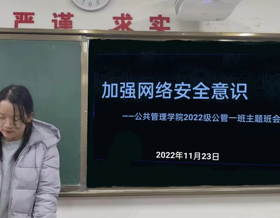为宣传网络安全知识,提高同学们的网络认知能力,11月23日,公管一班在宣传委员雷雅琪的带领下召开了以“加强网络安全意识”为主题的网络安全警示教育主题班会。同学们首先通过五个案例了解了网络行为及特点和加强网络安全意识的必要性。接下来,同学们通过具体的案例直观了解了忽视网络安全与准则所带来的严重后果;最后,同学们一起学习了大学生发表不当网络言论造成的危害以及8条网络行为准则。此次班会使同学们进一步加强了网络安全意识,同学们纷纷表示要将网络安全教育付诸生活实践。