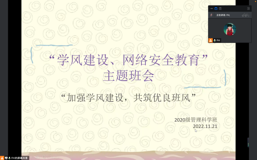 11月22日上午,2020级行政管理班在教学楼6110教室开展学风建设主题教育班会。此次主题班会警示同学们严守学校的规章制度,恪守做人的道德底线,教育同学们诚实守信,不考试作弊,不学术造假,共同营造良好的学习氛围和清正的学术氛围。