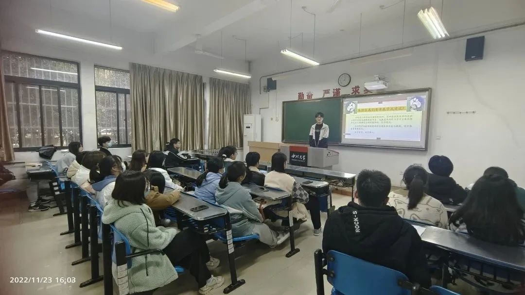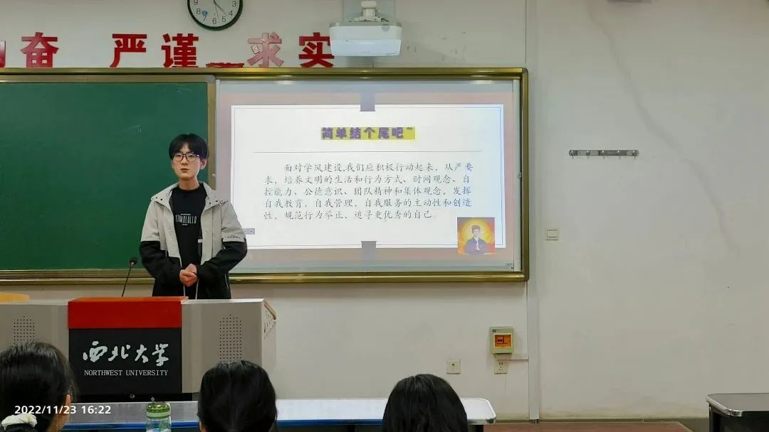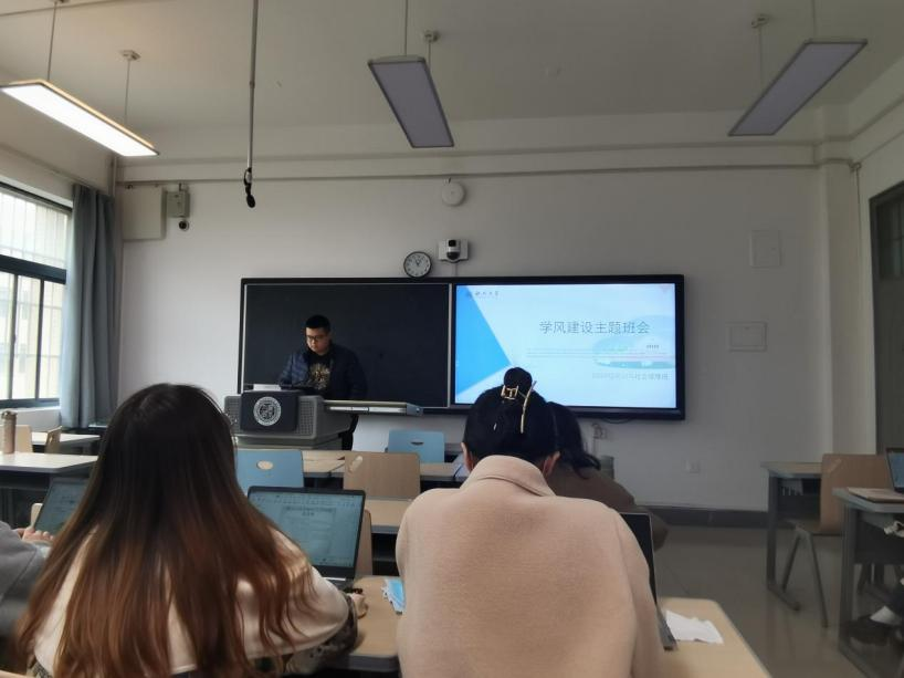 会议由班长杨泽曦同学组织召开。首先,他就“学风建设”展开介绍,向同学们讲述了学风建设的重要性,指出“学风建设对人的影响是潜移默化的,良好的学风建设能促进我们实现自我完善,同时,学风建设也是一个学校营造良好氛围的关键。”通过PPT展示、视频分享,同学们认识到学校加强优良学风建设的初衷所在。