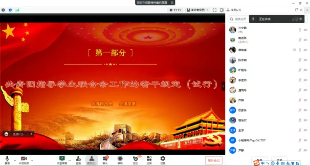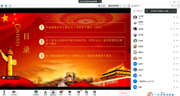 席祎瀛同学带领大家学习了《共青团指导学生联合会工作的若干规定(试行)》《关于落实共青团和学联对高校学生(研究生会)指导管理责任的若干规定》,从共青团对学联的政治指导、组织建设指导、学生会组织骨干培训指导、具体业务指导等方面为大家详细解读。主席团成员孙文静同学带领大家学习了《关于推动高校学生会(研究生会)深化改革的若干意见》。《意见》要求高校研究生会要明确职能定位、改进运行机制、塑造清新形象、完善领导体制。研究生会各部门成员要积极响应文件精神,明确责任使命,加强沟通合作。