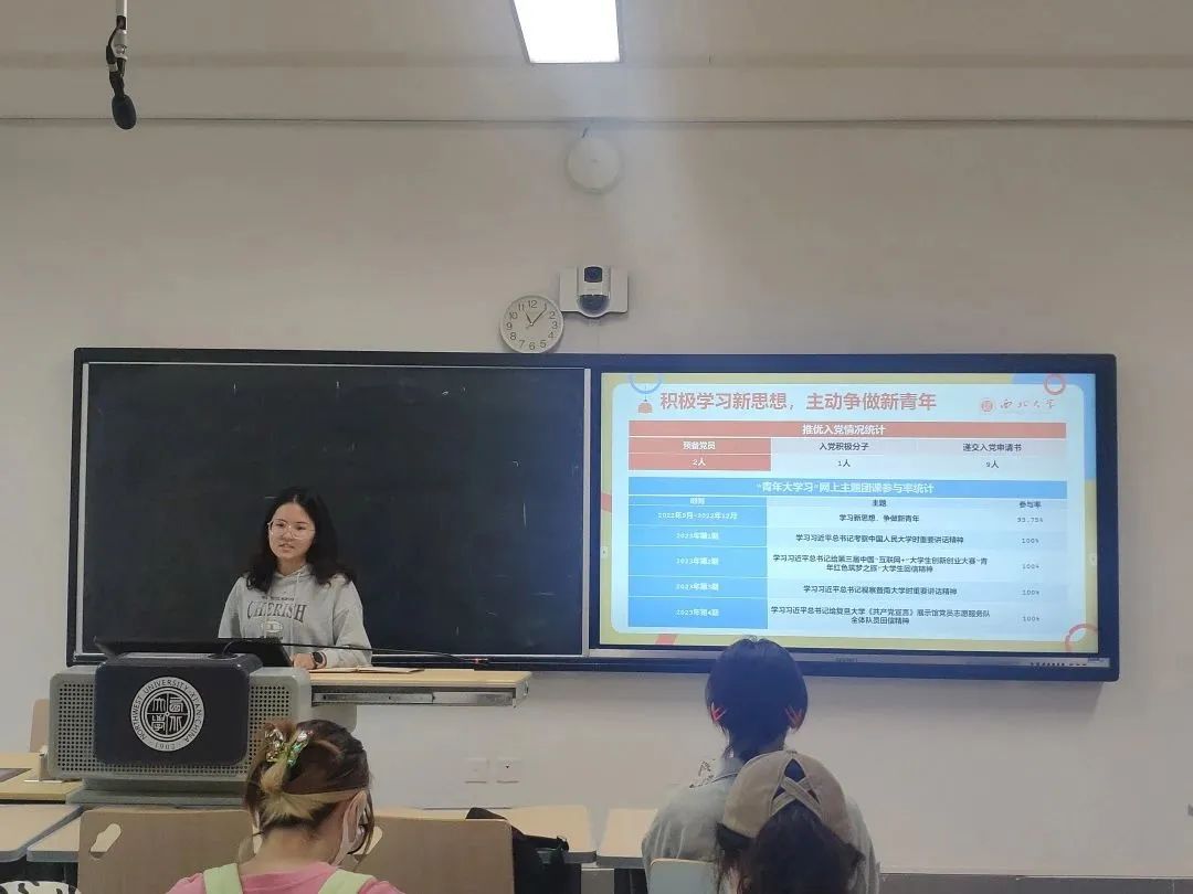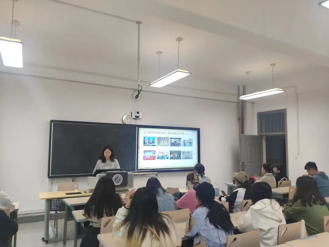 首先,班长王萱瑜为同学们“数”说班级,通过统计及汇报班级同学在推优入党、专业学习、科研竞赛、文体活动、社会实践与志愿服务等方面的成绩数据,展现出2021级图书馆学班同学们刻苦学习、积极备战竞赛、助力创新创业的奋进风采,彰显出全班同学以社会实践促进步、用志愿活动献青春的责任担当。王萱瑜表示,从这一个个数字中可以看出班级中存在许多非常优秀的同学,在学习、文体方面都格外出彩,全班同学应积极向其看齐,但也要相信并欣赏自身优点,他人的优点值得学习、自我的优点值得肯定,大家都是彼此的榜样。同时,她还指出学习不仅是课上对书本的学习、课下对兴趣的钻研,更包括学习一项新本领、掌握一个新技能,比如街舞、唱歌、射艺、足球。学风建设重在变“被动”为“主动”,即同学们形成主动学习的习惯,多方面发展、多领域学习,成为学习型人才,坚持“终身学习”,共同建设“学习型社会”。