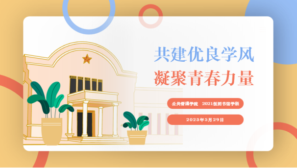 为进一步加强班级学风建设,营造优良学习氛围。2023年5月29日,2021级图书馆学班在6411教室召开“共建优良学风,凝聚青春力量”主题班会。此次班会由班长王萱瑜主持,她以争创优良学风、班风和考风为重点,从课堂考勤入手,着力严明课堂纪律,树立榜样学习典范,努力实现班级的自我教育、管理和服务。