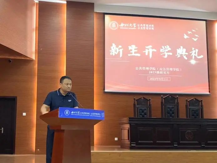 2023年9月1日上午10:00,565net必赢(应急管理学院)2023级研究生新生开学典礼在西北大学模拟法庭隆重举行。学院领导、教师代表、学工干部和2023级硕博新生参加大会,学院党委副书记韩杰主持典礼。