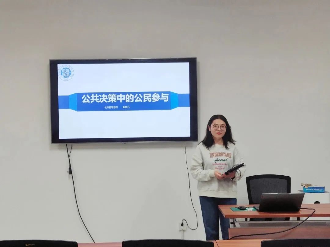 2022级行政管理专业硕士研究生赵梦凡分享的书籍是约翰·克莱顿·托马斯的《公共决策中的公民参与》,她的汇报内容主要包括作者及内容简介、著作框架、主要内容与观点、感悟思考。首先,她根据著作的整体框架,概述作者在著作中提出具有核心地位的公民参与的有效决策模型,以此解释公共管理者应该在何时,以何种方式吸引公民参与的基本分析框架。其次,她阐述了作者在本书中的主要观点:公民参与是信息时代政治社会生活不可或缺的一部分,是政府和公共管理者必须面对的环境和情形。作者提出的公民参与的有效决策模型为公共管理者提供一个将公民参与与公共管理相互平衡和结合的思考框架,根据公民参与有效决策模型的适用条件,选择公民参与的具体特定途径,是公共管理者所需必备的管理技能与策略工具。最后,她结合本书主要内容分享了此次阅读著作的感悟启示。