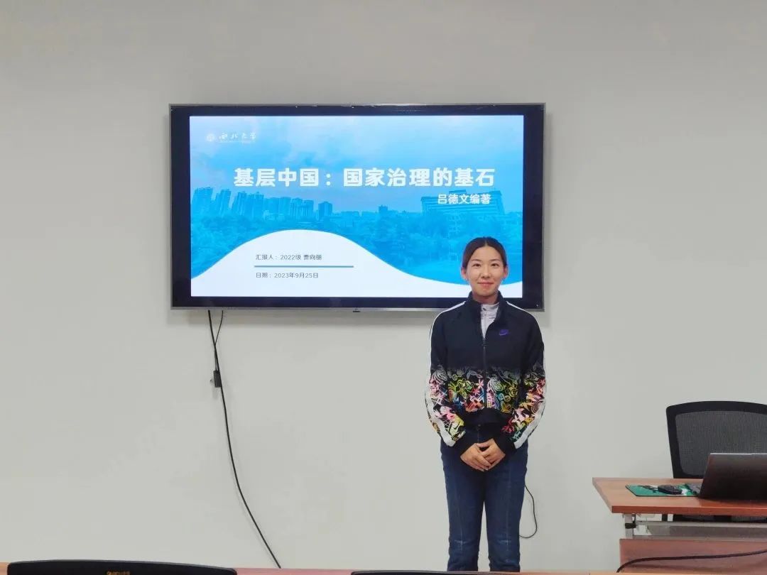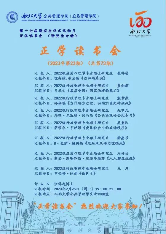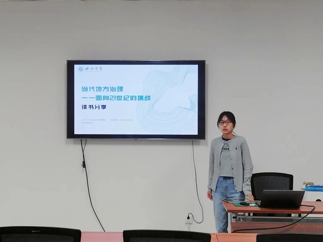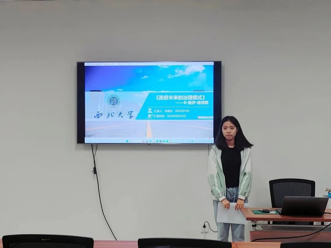 2023年9月25日下午,我院在西学楼北1308举办了2023年第23期正学读书会。西北大学565net必赢2022级行政管理专业硕士研究生吴重阳、2022级应用心理学专业硕士研究生崔祎萌、2022级行政管理专业硕士研究生贾向丽、2022级行政管理专业硕士研究生袁紫燕、2022级行政管理专业硕士研究生赵梦凡、2022级行政管理专业硕士研究生徐嘉乐、2022级应用心理学专业硕士研究生刘梓洁、2022级行政管理专业硕士研究生王淳分别作为主讲人进行读书汇报,565net必赢2023级博士研究生张锦超担任评议人,部分研究生旁听了此次读书会。