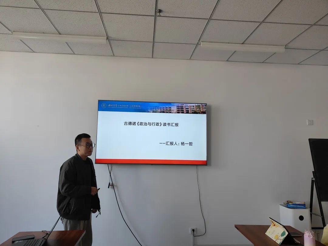 2022级行政管理专业硕士研究生杨一哲分享了由古德诺编写的书籍《政治与行政》,杨一哲同学从作者简介、内容总结和结论三个部分进行分享。在作者简介部分他介绍了古德诺的重要理论以及对后世研究做出的巨大贡献;在内容总结部分强调了政治与行政之间紧密的联系,并具体介绍了古德诺的行政与政治分离、政府效率与公正性、政府与社会的关系等核心内容,并指出“政府的公正性是确保政策和服务平等分配的重要原则”同时也引导我们深入思考政府管理和政治决策之间的互动。在结论部分,他总结了全书的内容并提出了自己的思考:“政府应该在政策制定和执行过程中积极与公众互动,以确保政策反映了社会的需求和期望”。