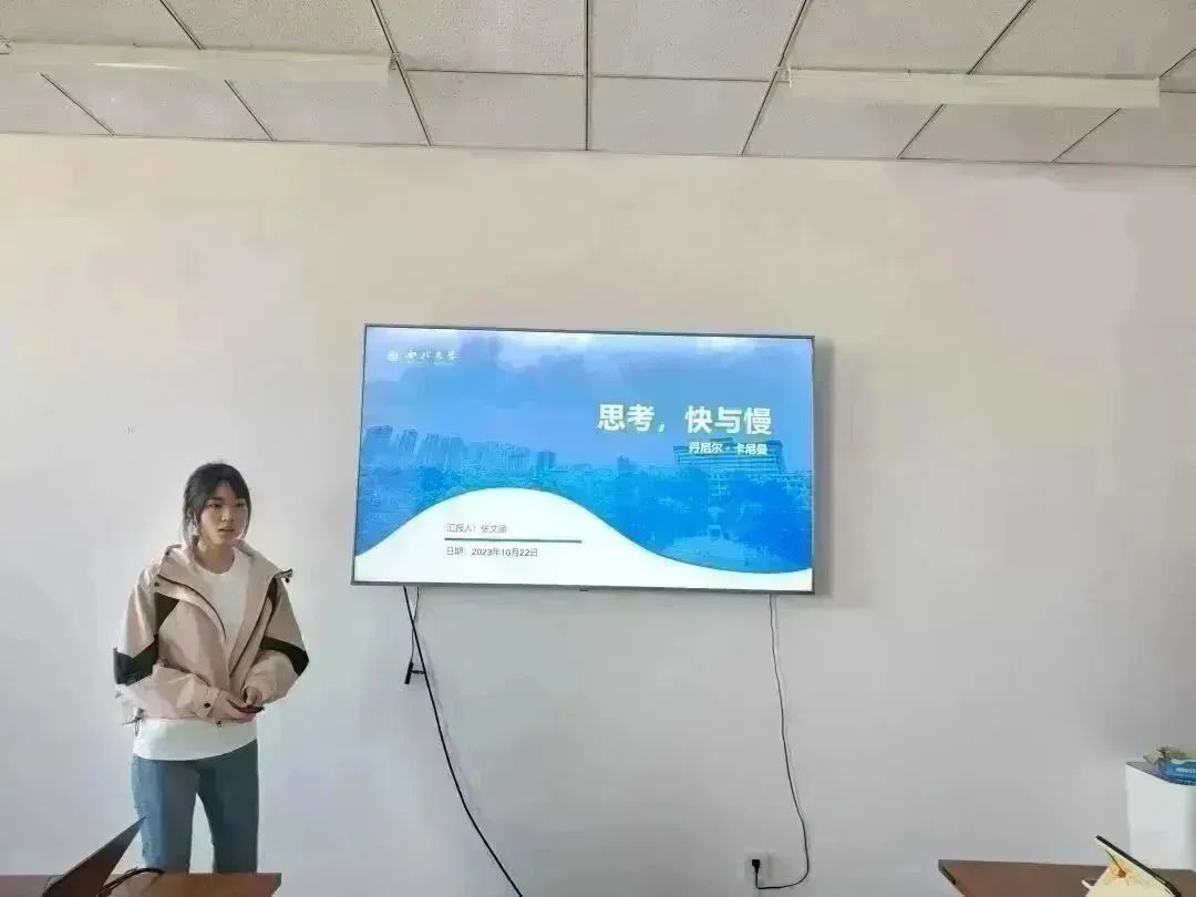 2022级应用心理学专业硕士研究生张文涵分享了由丹尼尔·卡尼曼编写的书籍《思考,快与慢》,她从作者简介、内容分享及个人体验三个部分进行汇报。在内容分享部分,她主要分享了书中提到的系统1与系统2的区别与联系、启发法与偏见、过度自信与决策失误,并重点介绍了卡曼尼在书中提出的大脑的两种做决定的方式:系统1和系统2即快系统与慢系统;在个人体验部分,张文涵同学分享了自己对于本书的看法,以及规避书中提到的风险和问题的一些思考,同时希望可以运用不同技巧来避免那些常常使我们陷入麻烦的思维失误。