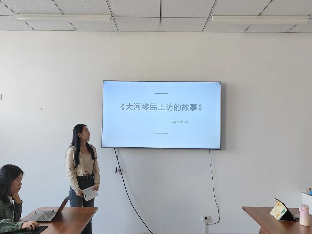 2022级行政管理专业硕士研究生杜玉婉分享了由应星编写的《大河移民上访的故事》,她分别从作者和目录介绍、选题缘由、内容分析和理解感悟四个部分进行分享。她首先介绍了“应星以大河移民上访这一个案为切入点去剖析中国农村社会权利运作的技术和基本机理”,是帮助我们了解基层治理的一个好的切口。其次,她通过介绍阶层分化、冲突形成与发展的原因与过程等书中的核心内容,点明了“冲突的发展是双方运用技术进行的试探和斗争的过程”,紧接着,她说明了冲突化解的具体措施。最后,她谈到田野调查这一方法对于社会科学研究的重要作用与意义,同时表达了自己对于移民、基层政府、高层政府三种利益角色在基层治理中的关系的思考。
