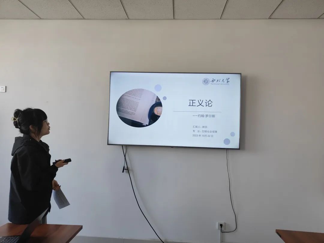 2022级社会保障专业硕士研究生颜羽分享了由约翰·罗尔斯编写的《正义论》,她首先从作者简介和著作背景入手介绍了《正义论》一书写就的时代背景和理论渊源;其次,她总体性的概括了本书3编9章的框架;紧接着梳理了各章节内容,分别对理论篇、制度篇、目的篇进行了展开,同时着重分享了理论篇中的“平等自由、机会平等的原则”以及目的篇中的“合理的善”;最后,她分享了阅读本书后的心得体会,她将努力成为一个合格的社会保障理论研究者。