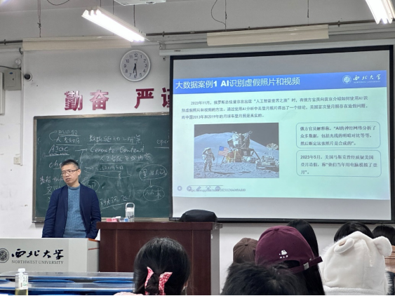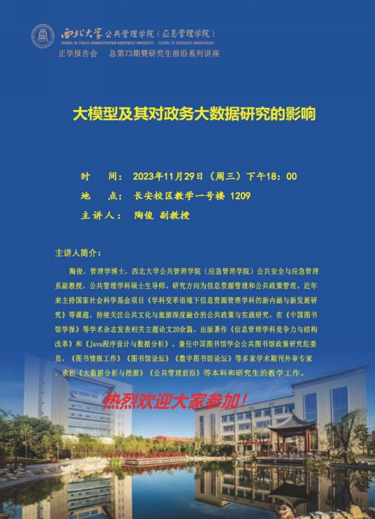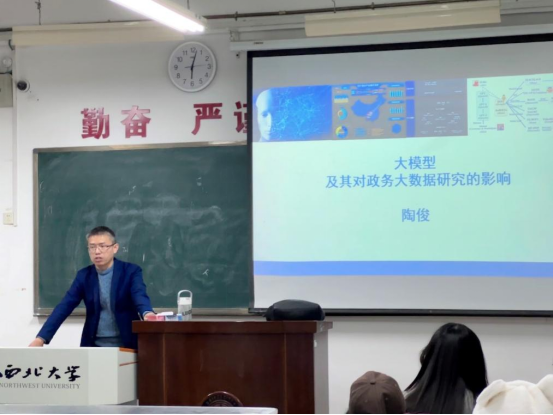 2023年11月29日晚,西北大学565net必赢陶俊副教授在长安校区教学一号楼1209教室为我院2023级全体硕士研究生作了题为“大模型及其对政务大数据研究的影响”的专题讲座。