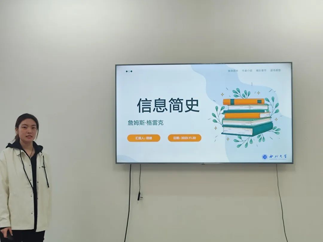2022级图书馆学专业硕士研究生阴婕分享的书籍是詹姆斯·格雷克的《信息简史》,她从推荐图书、作者简介、精彩章节以及读书感悟四个部分进行了阐述。她首先表明选择本书的缘由以及本书所取得的成就。其次,她对本书作者詹姆斯·格雷克进行了简要介绍。紧接着,她从信息的历史、信息理论以及信息掀起的洪波三方面对本书精彩章节进行梳理和分析。最后,她围绕本书的独特之处提出了自己的读书感悟。她提出,本书的特点是富有语言魅力、构图视野广、逻辑性强以及作者构建出的信息观。
