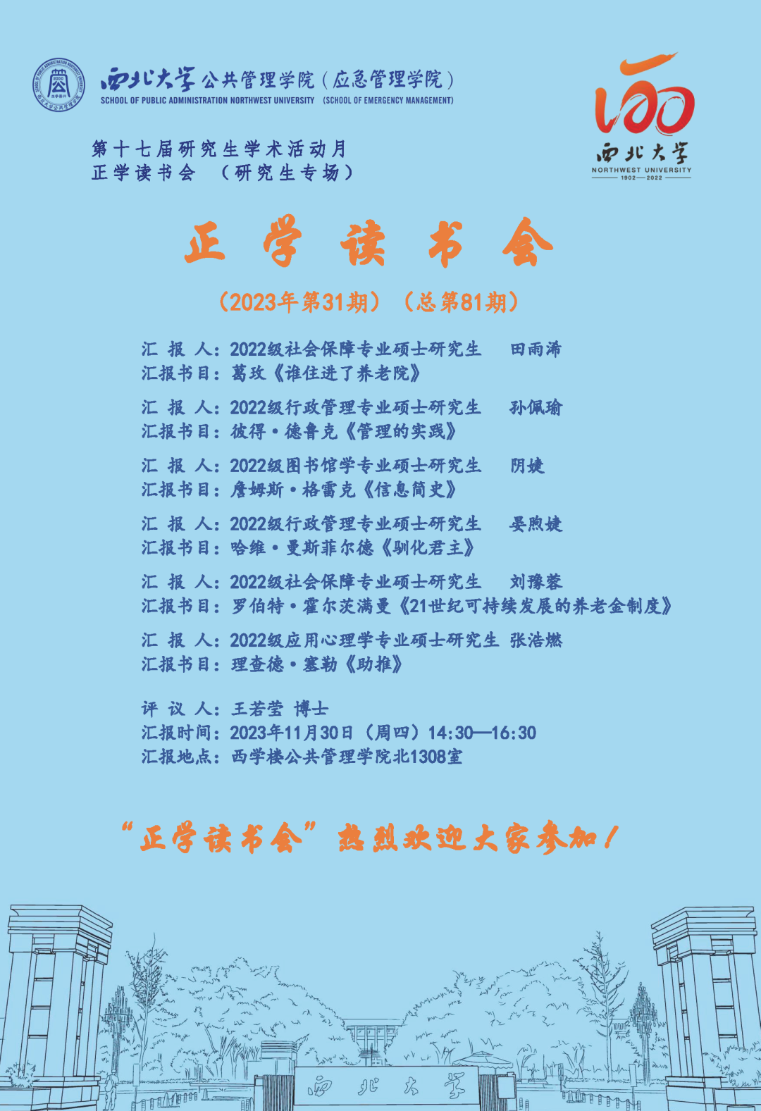 2023年11月30日下午,我院在西学楼北1308室举办了2023年第31期正学读书会。2022级社会保障专业硕士研究生田雨浠、2022级行政管理专业硕士研究生孙佩瑜、2022级图书馆学专业硕士研究生阴婕、2022级行政管理专业硕士研究生晏煦婕、2022级社会保障专业硕士研究生刘豫蓉、2022级应用心理学专业硕士研究生张浩燃分别作为主讲人进行读书汇报,565net必赢2023级博士研究生王若莹担任评议人,部分研究生旁听了此次报告会。