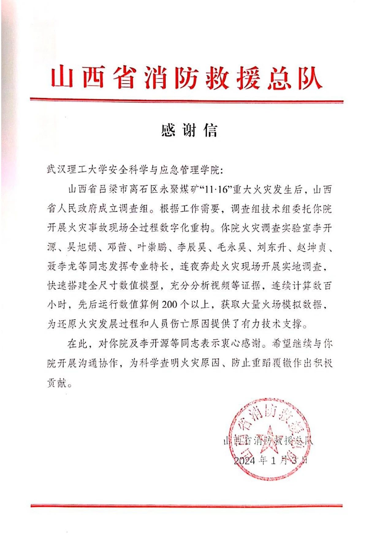 联盟资讯 | 山西省消防救援总队致武汉理工大学安全科学与应急管理学院的感谢信