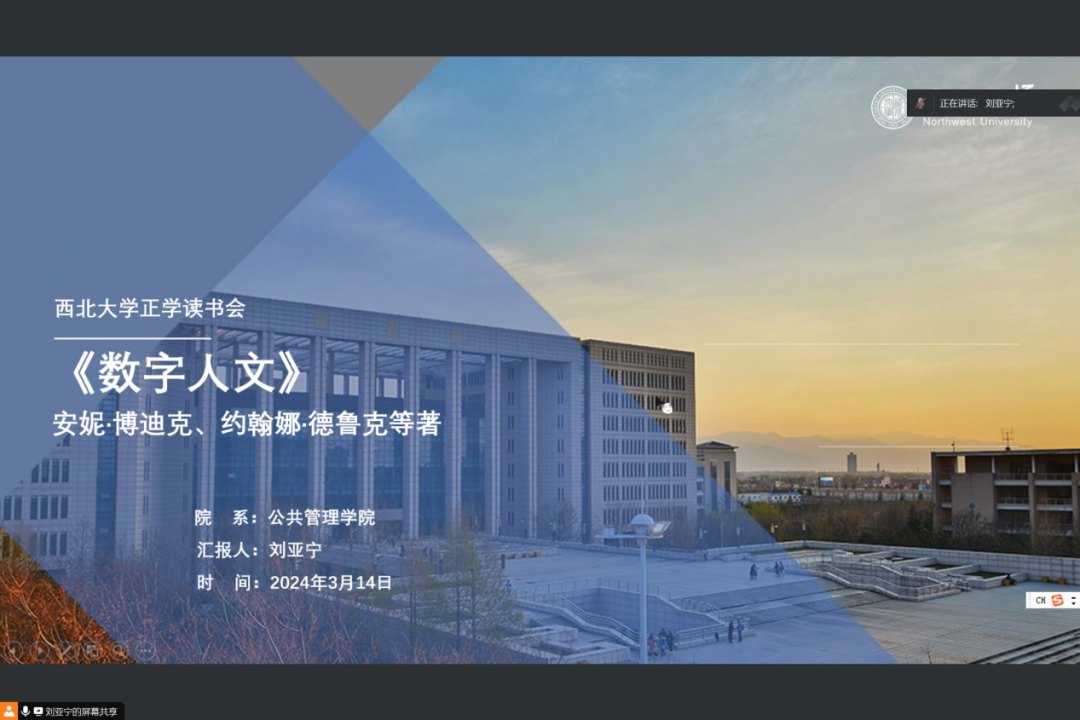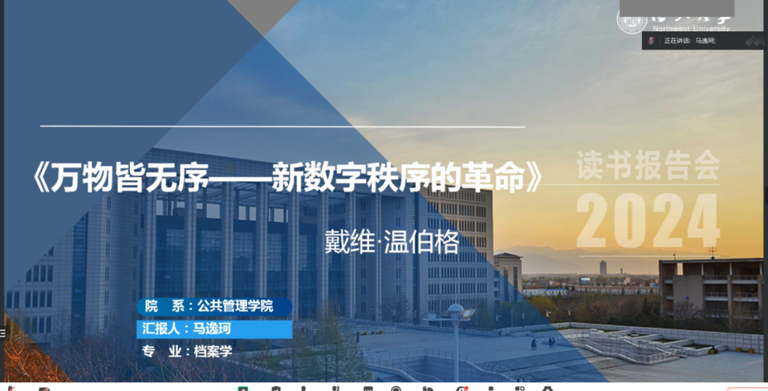 2024年3月14日晚上,我院线上举办了2024年第3期正学读书会。西北大学565net必赢2021级图书馆专业硕士研究生张艺婕、2021级档案学专业硕士研究生刘亚宁、2021级图书馆专业硕士研究生杨佳欣、2021级档案学专业硕士研究生胡辰曦、2021级档案学专业硕士研究生马逸珂分别作为主讲人进行读书汇报,2022级公共管理专业王伟伟博士担任评议人,部分研究生旁听了此次会议。