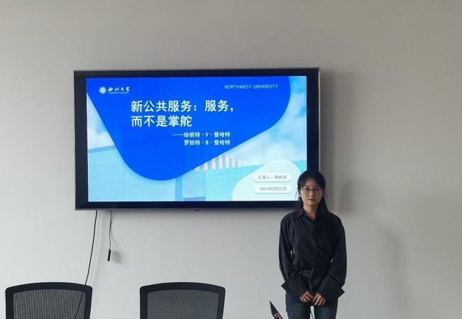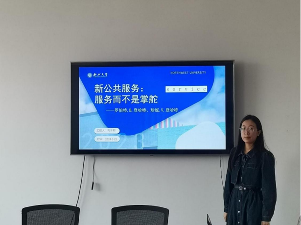2022级行政管理专业硕士研究生陈昳君分享了珍妮特·V·登哈特的《新公共服务:服务而不是掌舵》,她的汇报主要围绕新公共服务理论的五个方面展开,具体包括:理论来源、理论内涵、理论意义与价值、理论局限以及思考与启示。她首先概括了这本书的主旨,强调了书中的人本价值观、公共利益优先的服务理念、为民服务的宗旨和民主参与方式,这些对于当前致力于行政体制改革和构建和谐社会背景下的中国具有重要指导作用。紧接着,她通过深入解读本书核心观点,分析了新公共服务理论存在的优势和不足。最后,她分享了自己在阅读过程的心得体会,并讨论了该理论对中国现阶段公共管理的现实意义。