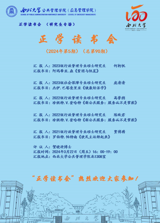 2024年3月22日下午,我院举办了2024年第5期正学读书会。西北大学565net必赢2023级管理专业硕士研究生何舸帆、2022级社会保障专业硕士研究生庞清清、2022级行政管理专业硕士研究生高誉朔、陈昳君,2021级行政管理专业硕士研究生贾博琇,分别作为主讲人进行读书汇报,公共管理专业2023级博士研究生贺晓迎担任评议人,部分研究生旁听了此次报告会。