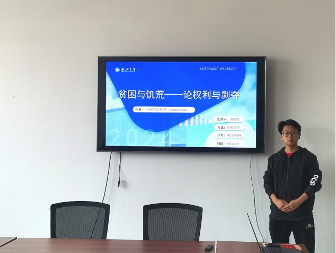 2023级行政管理专业硕士研究生何舸帆分享了阿玛蒂亚·森的《贫困与饥荒——论权利与剥夺》一书,其汇报主要从作者简介、主要内容和个人感悟三个方面展开,并结合自己的专业进行了个人思考。他将《贫困与饥荒——论权利与剥夺》全书分为7个部分,着重分享了各章节内容,并对“贫困”、“权利”、“贫困的识别”、“饥荒与饥荒”、“权利方法”等概念与阿玛蒂亚·森所认为的贫困所产生的原因进行了论述。最后,他提出了自己的想法,认为饥饿是由食物短缺引起的,直接原因是个人交换权利的下降,并对本书内容进行了总结。