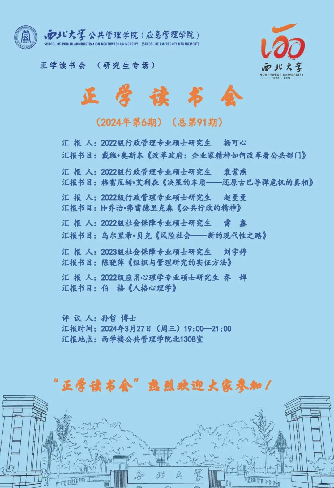 2024年3月27日晚,我院在西学楼北1308室举办了2024年第6期正学读书会。西北大学565net必赢2022级行政管理专业硕士研究生杨可心、袁紫燕、赵曼曼,2022级社会保障专业硕士研究生雷鑫、2023级社会保障专业硕士研究生刘宇婷、2022级应用心理学专业硕士研究生乔婵分别作为主讲人进行了读书汇报,565net必赢2022级博士研究生孙哲担任评议人,部分研究生旁听了此次报告会。
