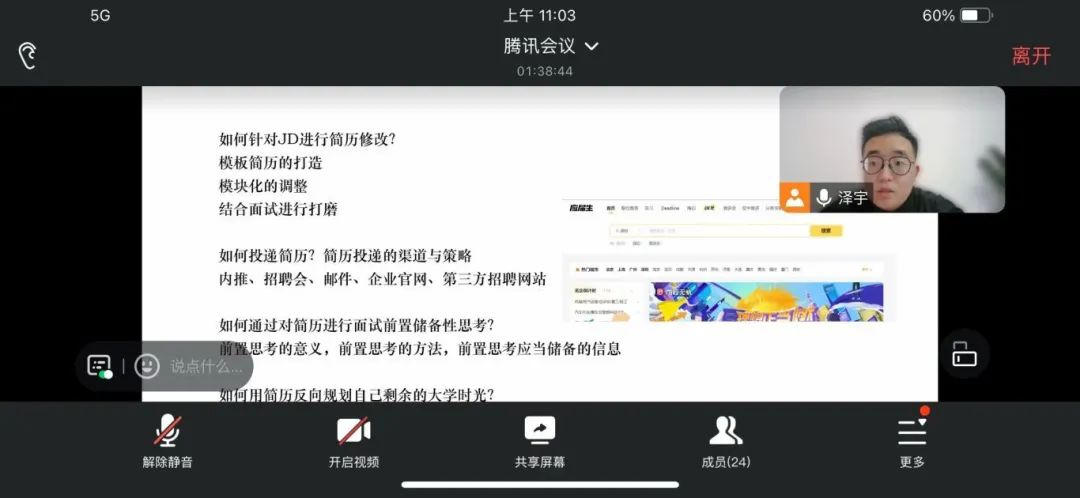 首先,王泽宇学长以“如果求职是一场游戏,那么这场游戏的规则是什么”这一问题引入,紧扣“解决简历写作中遇到的实际问题”的主线,通过闯关的方式阐明简历写作前的思维建设和信息整理、简历写作中的实操方法以及简历写作后的复盘优化三个简历写作过程中重要的结构主体,并将这一过程分解为12个大问题、23个小问题,带领同学们一起思考简历写作的“道、术、法”。在本次讲座中,王泽宇学长针对信息不对称的现实情况,聚焦社会博弈性思维,结合自己的求职经验与工作经历,为同学们提供了效果好、可实操的简历写作建议。