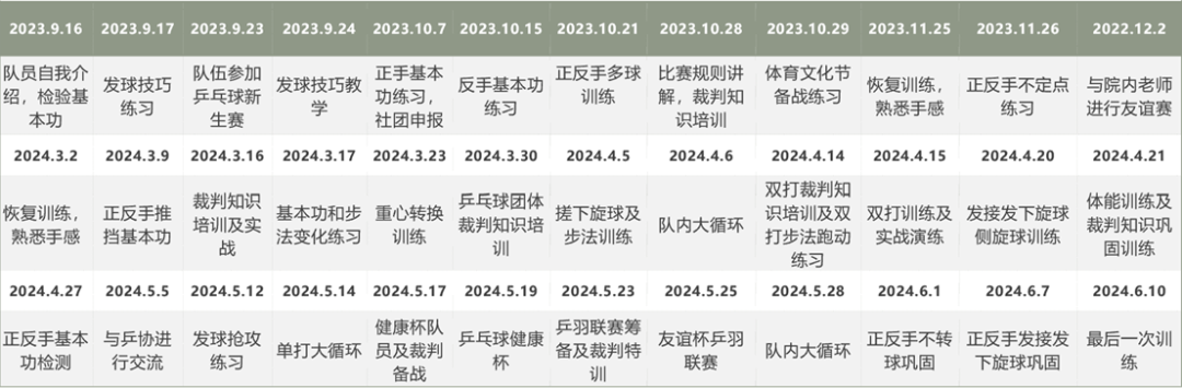 2023年9月到2024年6月,乒乓球队队员参加了2023乒协新生赛、体育文化节乒乓球新生赛、彩虹杯乒乓球团体赛、健康杯乒乓球赛、第二届“友谊杯”跨院系乒羽联赛等多项比赛。