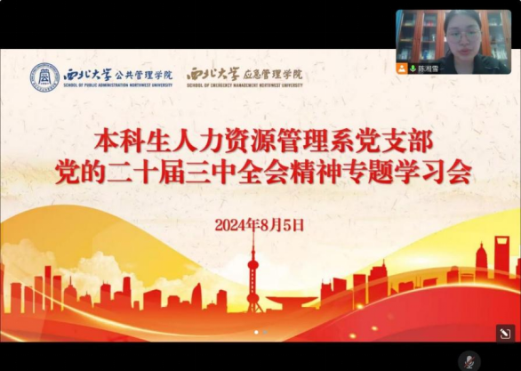 2024年7月15日至18日,中国共产党第二十届中央委员会第三次全体会议胜利举行。党的二十届三中全会是新时代新征程上推动全面深化改革向广度和深度进军的总动员、总部署,为深入学习贯彻党的二十届三中全会精神,我院本科生人力资源管理系党支部于8月5日在线上开展党的二十届三中全会精神集体学习会。会议由党支部副书记陈湘雪同志主持,支部全体党员参会。