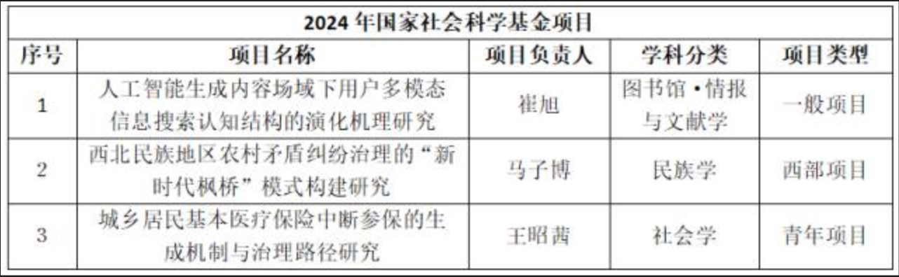 在国家社会科学基金和国家社会科学基金教育学项目申请中,学院共有14位教师申报,经过数次打磨申报书和线下论证会最终4人立项。具体项目为:崔旭教授申报的《人工智能生成内容场域下用户多模态信息搜索认知结构的演化机理研究》、马子博老师申报的《西北民族地区农村矛盾纠纷治理的“新时代枫桥”模式构建研究》、王昭茜博士后申报的《城乡居民基本医疗保险中断参保的生成机制与治理路径研究》和张冰冰老师申报的国家社科教育学项目《“双一流”高校有组织科研的跨界治理机制及实现路径研究》。