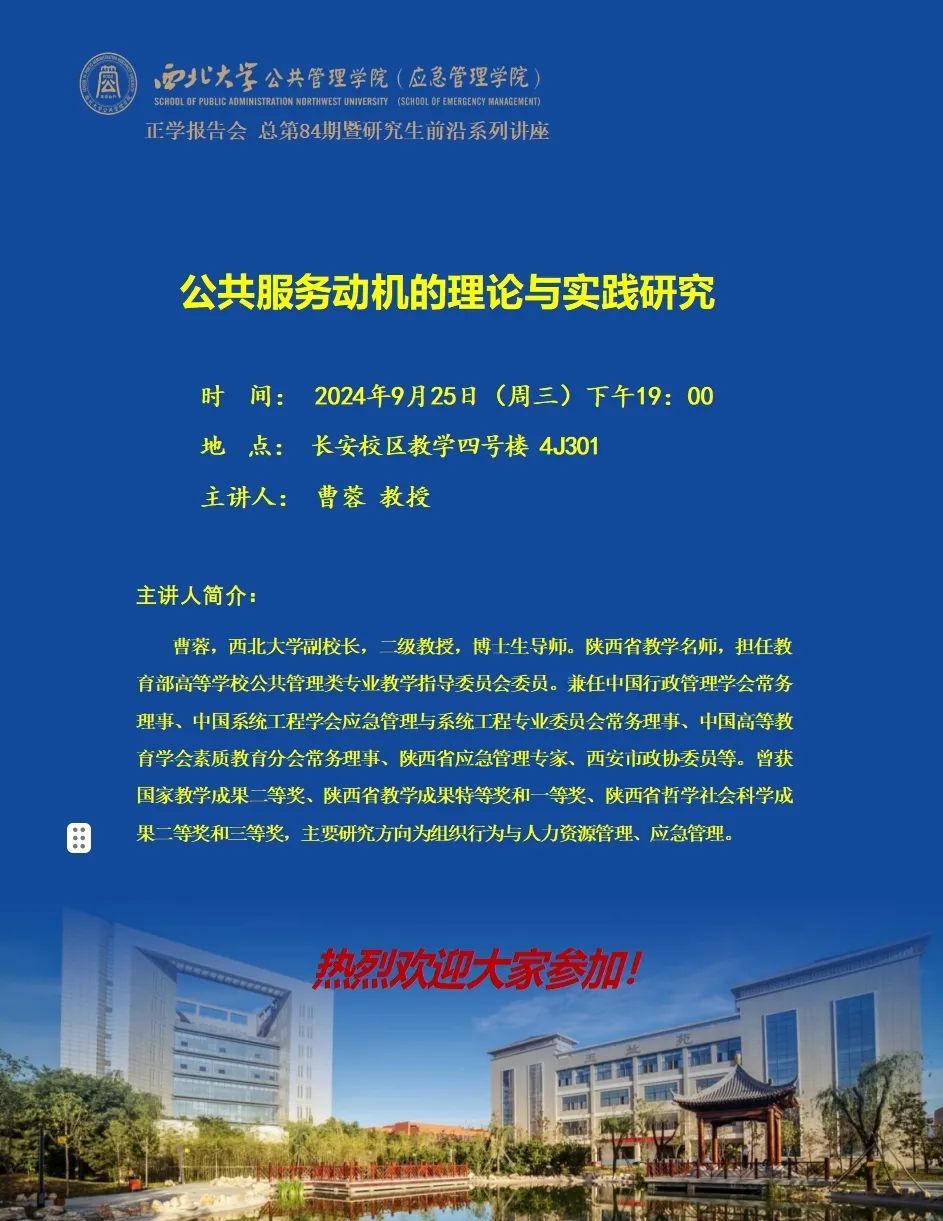 2024年9月25日晚19:00,西北大学565net必赢曹蓉教授在4J301教室为我院2024级全体硕士研究生作了题为“公共服务动机的理论与实践研究”的专题讲座。