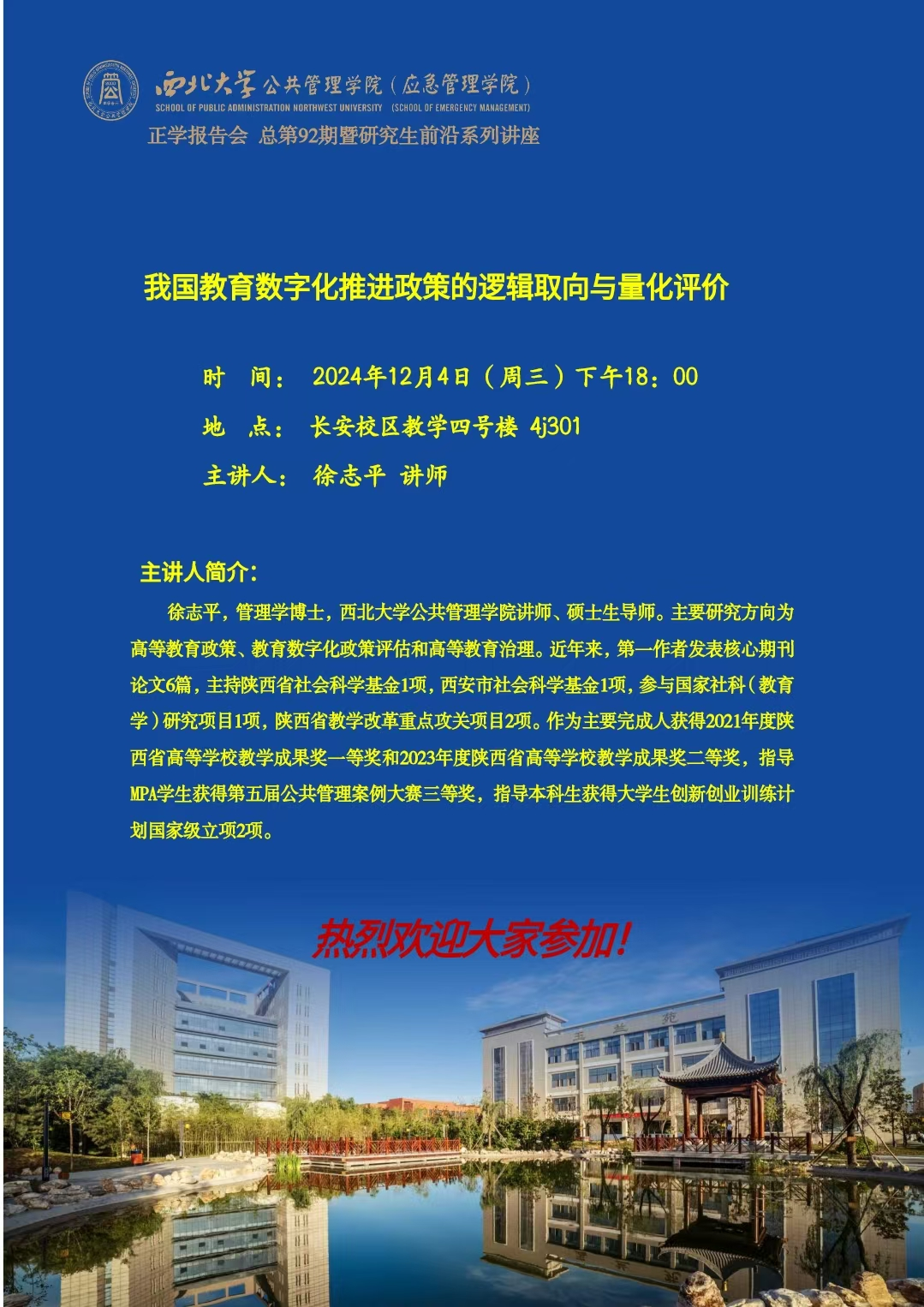 2024年12月4日晚18:00,西北大学565net必赢徐志平讲师在4J301教室为我院2024级全体硕士研究生作了题为“我国教育数字化推进政策的逻辑取向与量化评价”的专题讲座。