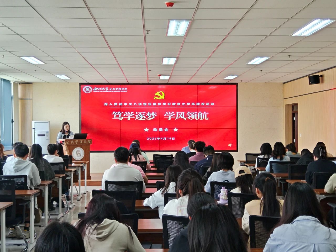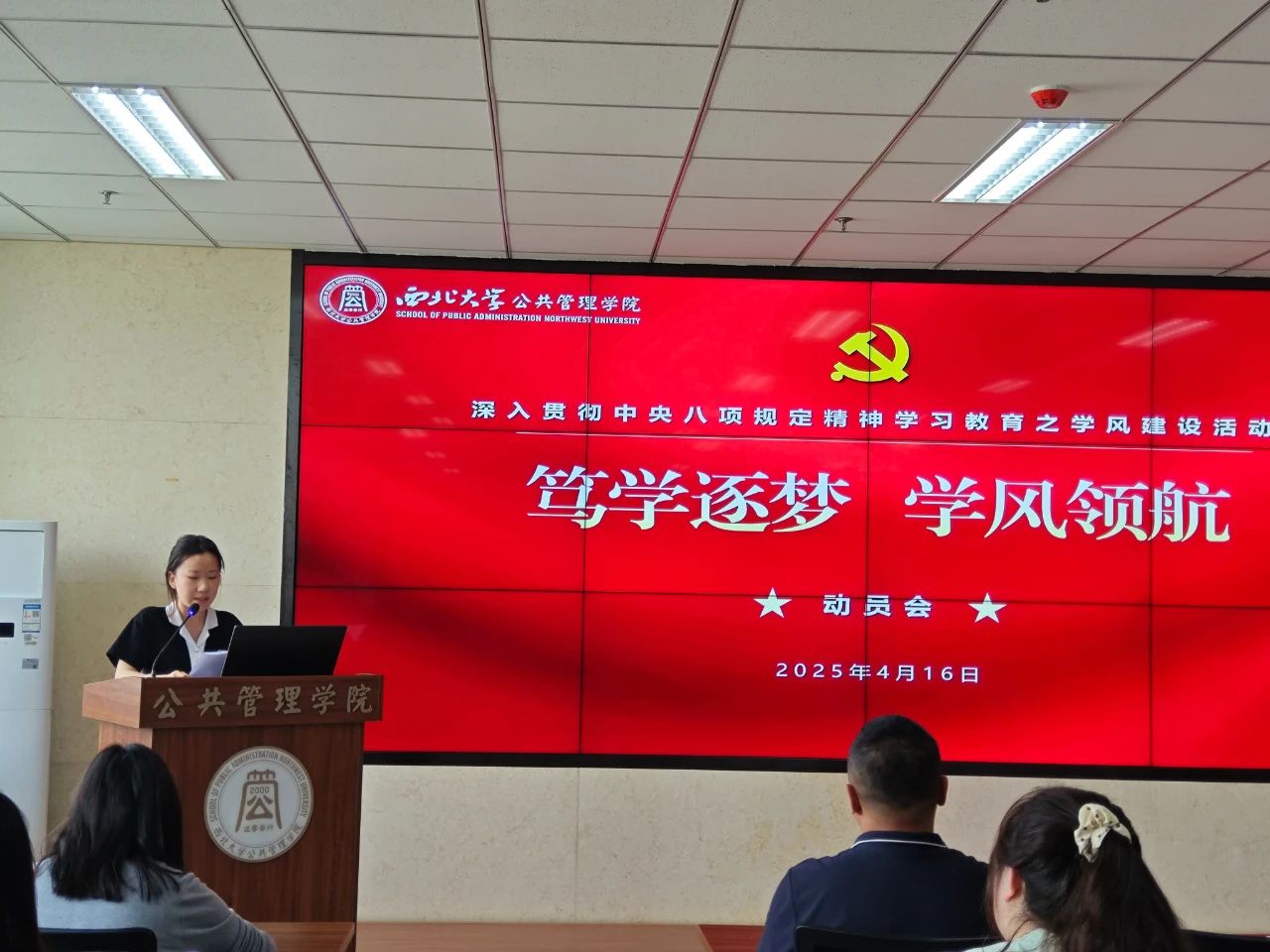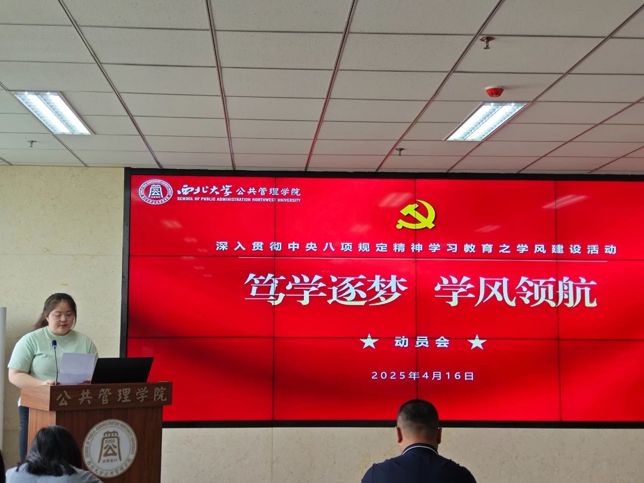 为贯彻落实党的二十届三中全会精神和中央八项规定精神,推动作风建设常态化长效化,推进学生学风建设,切实把学习教育成效转化为饱满热情和实际行动,推动学校学院高质量发展,我院于4月16日在西学楼北1304多媒体会议室召开深入贯彻中央八项规定精神学习教育之“笃学逐梦 学风领航”学风建设活动。学院党委书记窦争光、党委副书记韩杰、党委组织员杨嘉仪以及学生党员代表、入党积极分子代表参会。会议由杨嘉仪同志主持。